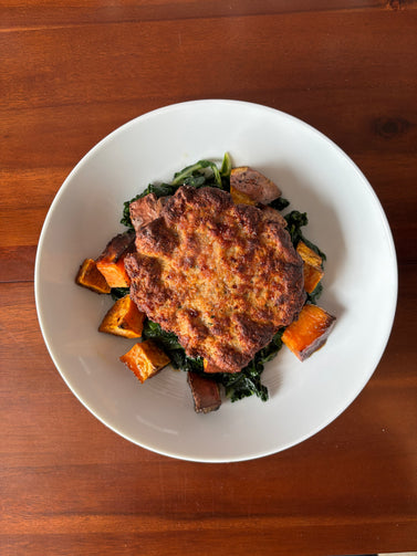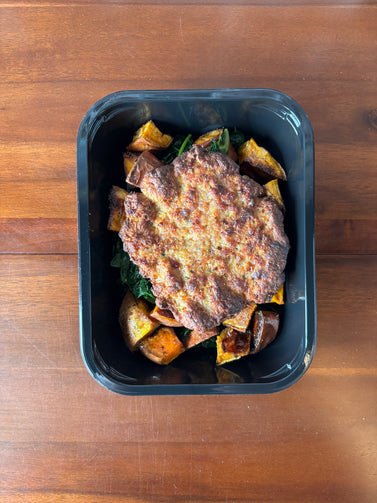Our 7oz turkey burger is seasoned and grilled to perfection, served with roasted sweet potatoes tossed in Cajun spice and finished with a touch of honey for subtle sweetness. Paired with sautéed garlicky greens, this plate delivers serious flavour with performance-focused nutrition.