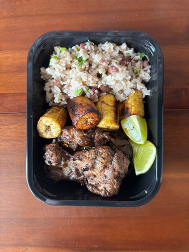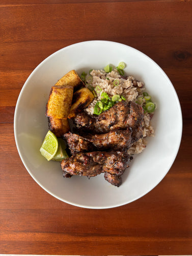 Served with rice + peas, baked sweet plantain, scallions and your choice of protein in our house made Jerk marinade.