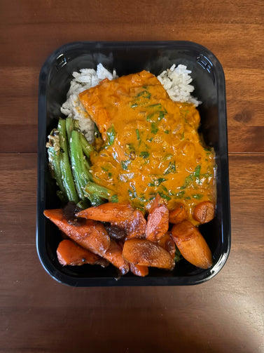 Garlicky green beans, steamed coconut rice, tamarind glazed carrots, Your choice of Protein in a rich Thai red curry coconut sauce