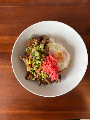 Our Tokyo Gyudon Bowl features perfectly seasoned sushi rice topped with your choice of protein, a soft-boiled egg, fresh scallions, pickled radish, and finished with our house-made sweet garlic teriyaki glaze.