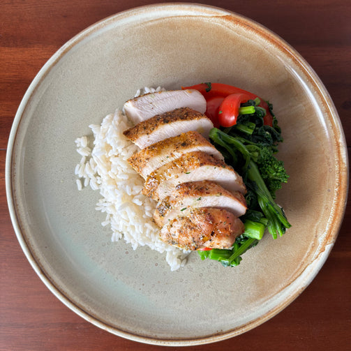 Roasted turkey breast paired with nutritious rapini and flavorful peppers, served over wholesome brown rice. Enjoy the perfect balance of taste and health in every bite.